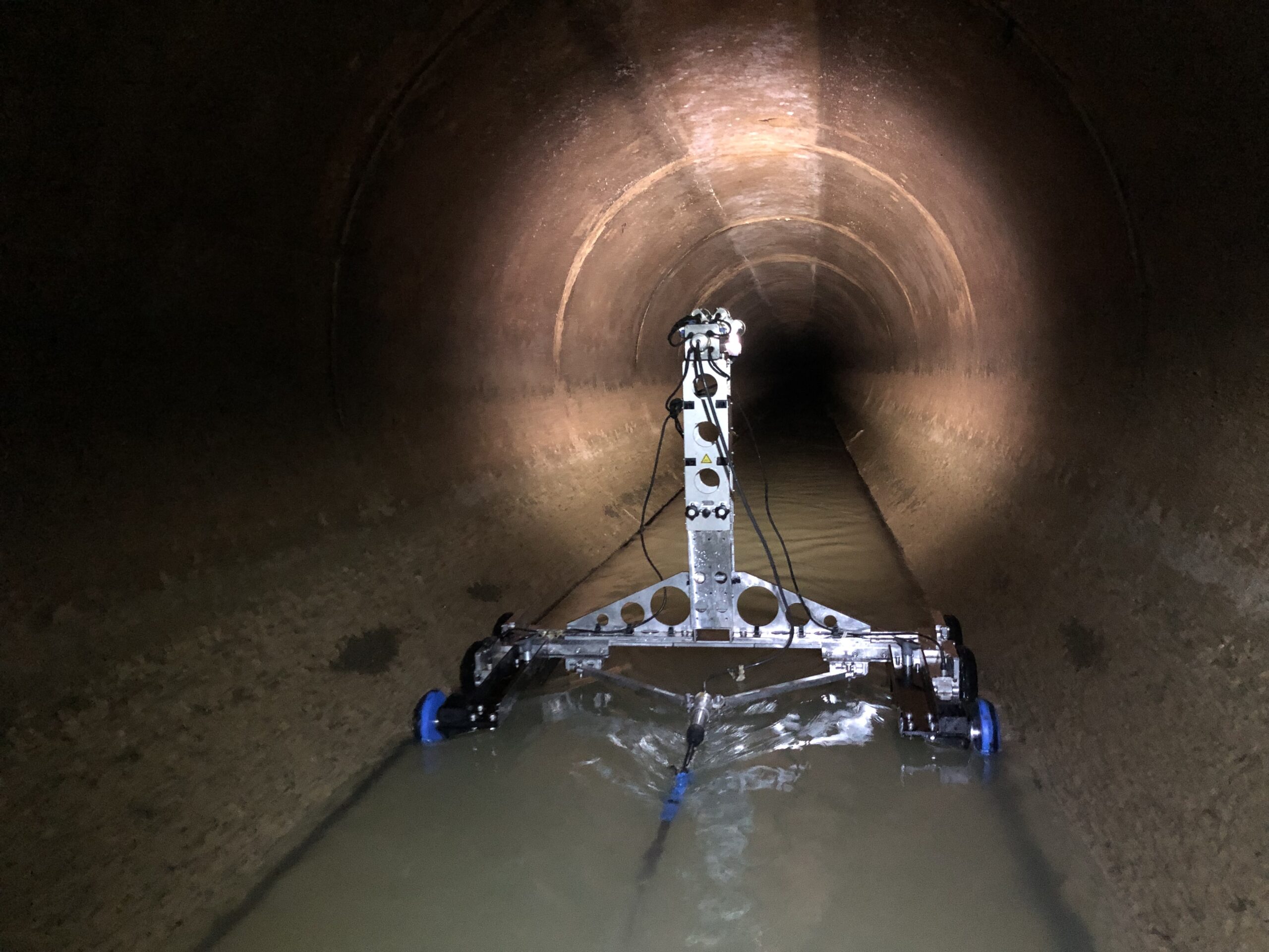 TVカメラ調査とは人が入って調査できない下水道管に遠隔操作による自走式TVカメラを走らせ、下水道管を調査することです。